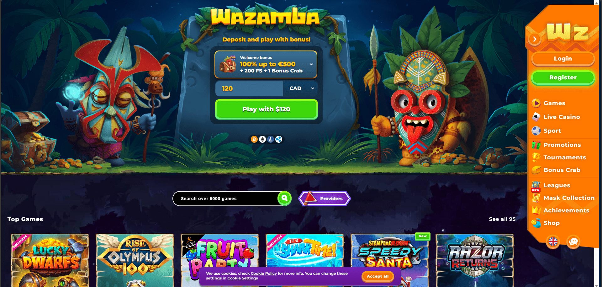 Members of Wazamba Casino can test their luck on a variety of games, such as table games and video slots, at this online casino. In addition, players can navigate the casino by selecting from three totemic characters, play games, earn achievements, and exchange coins for bonuses and other goodies. Additionally, the website features a number of highly regarded and productive software providers, such as Microgaming, Yggdrasil Gaming, NetEnt, Betsoft, iSoftBet, Habanero, GameArt, Quickspin, and Pragmatic Play. Members of the site can play instantly through a web browser and the site supports multiple languages, including English, German, and Russian. Through their mobile casino, they can be accessed while on the go. The Curacaoan government licenses and oversees Wazamba Casino.