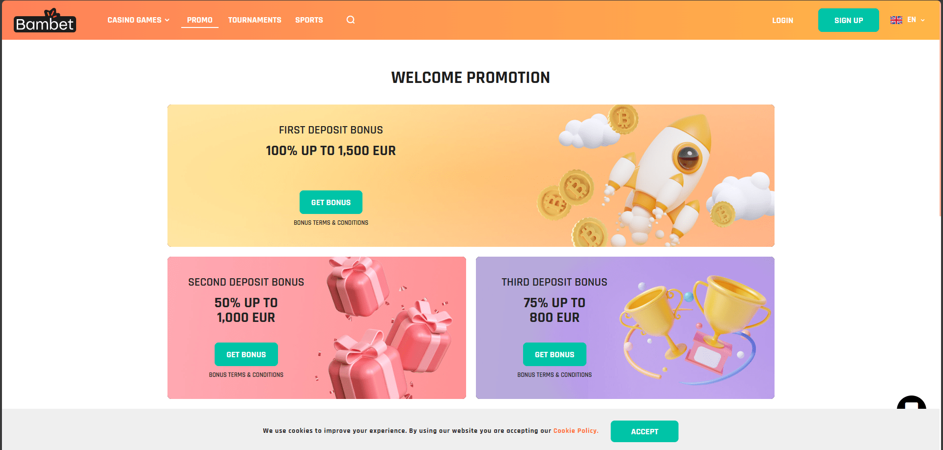 Bambetilla on tervetuliaispaketti, joka koostuu kolmesta bonuksesta. Ensimmäinen näistä on 100 % ottelu, joka tuplaa 300 euroon ja antaa 200 ilmaispyöräytystä. Samaan aikaan toinen on 50 % ottelu, josta saa 500 € asti, kun taas kolmas on 25 % ottelu ja 700 € asti. Vähimmäistalletus näille kaikille on 20 €, ja niissä kaikissa on 45-kertainen kierrätysvaatimus.